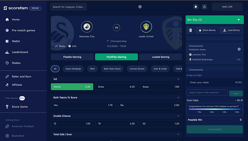 Scorefam is the first blockchain sports betting platform with risk profiles in the gamblefi landscape. Introducing an innovative approach to sports betting, Scorefam allows players, gamers, sports enthusiasts, and bettors to earn in their own unique way through the analysis/segmentation of risks through integration of artificial intelligence.